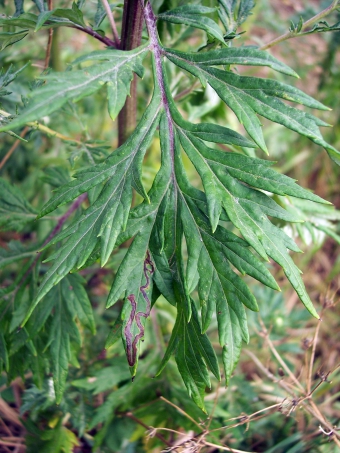 Vytrvalá, stříbřitě šedoplstnatá, 50 až 150 cm vysoká bylina. Lodyha hranatá, větvená, obvykle červeně naběhlá. Dolní listy dlouze řapíkaté, zpeřené, lodyžní listy poloobjímavé, 1x až 2x zpeřené, úkrojky kopinaté, zubaté nebo celokrajné, podvinuté, svrchu tmavě zelené, naspodu běloplstnaté. Úbory v bohatě větvených latách, 3 až 4 mm v průměru, květy žlutavé, hnědožluté nebo hnědočervené, jen trubkovité květy, zákrovní listeny ve 2 řadách, vnitřní delší, blanitě lemované, vnější kratší, plstnaté. Kvete v VII až X.
