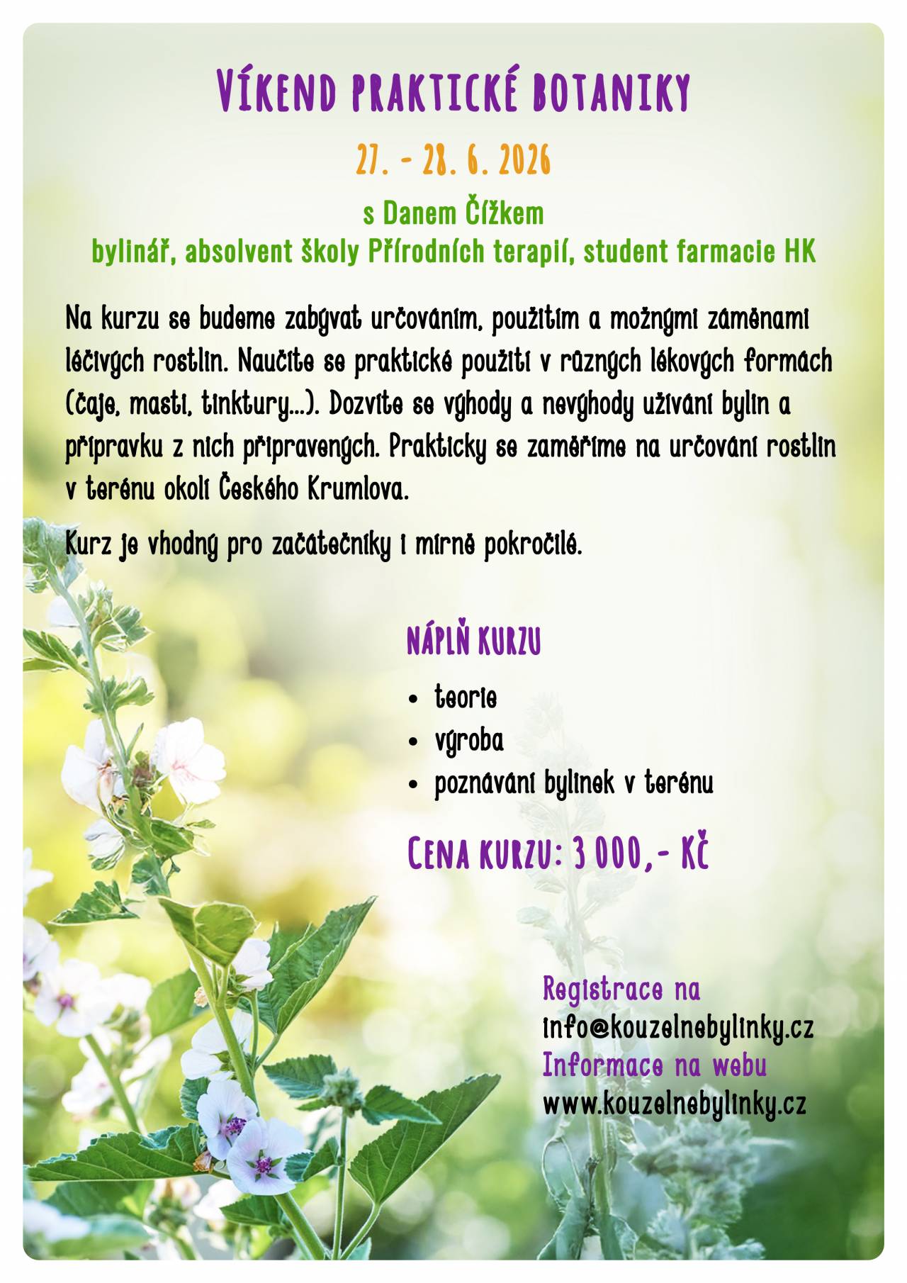 Na kurzu se budete zabývat určováním, použitím a možnými záměnami léčivých rostlin. Naučíte se praktické použití v různých lékových formách (čaje, masti, tinktury ...). Dozvíte se výhody a nevýhody užívání bylin a přípravků z nich připravených. Prakticky se zaměříme na určováni rostlin v terénu okolí Českého Krumlova. Kurz je vhodný pro začátečníky i mírně pokročilé.