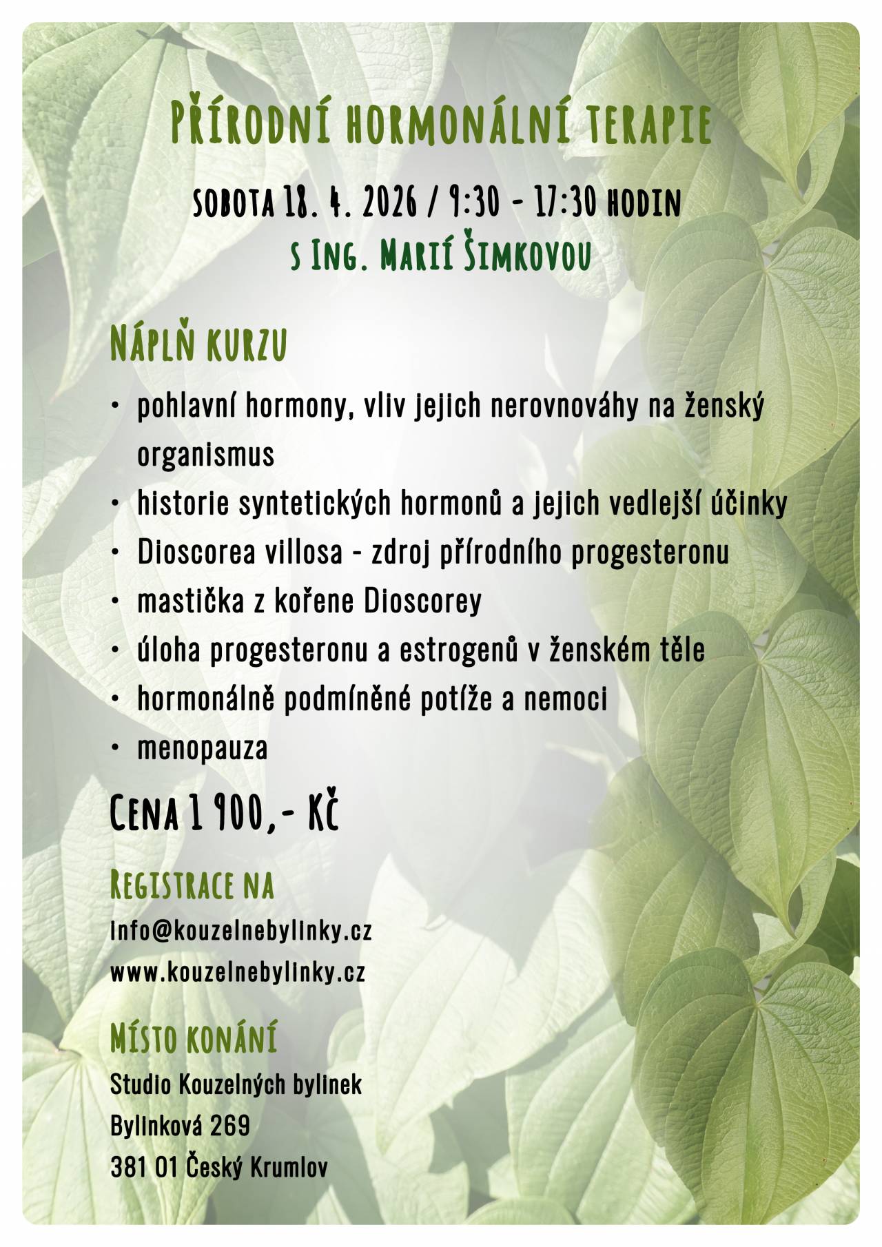 Zveme Vás na jednodenní kurz přírodní hormonální terapie s Ing. Marií Šimkovou.